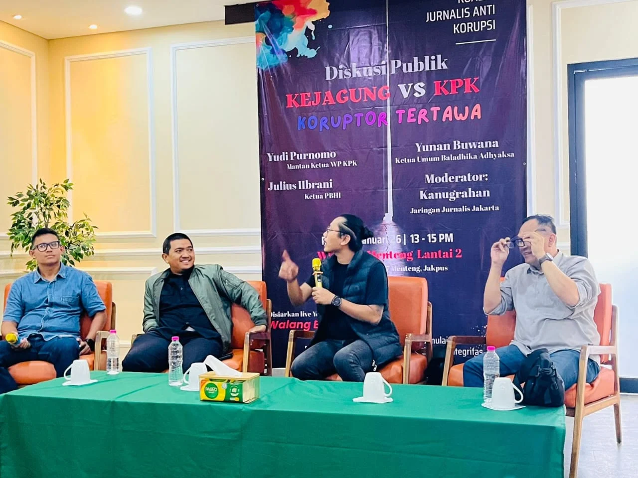 Diskusi tersebut menghadirkan mantan Ketua Wadah Pegawai KPK Yudi Purnomo, Ketua PBHI Julius Ibrani, dan Ketua Umum Baladhika Adhyaksa Yunan Buwana, serta dipandu Kanugrahan dari Jaringan Jurnalis Jakarta.