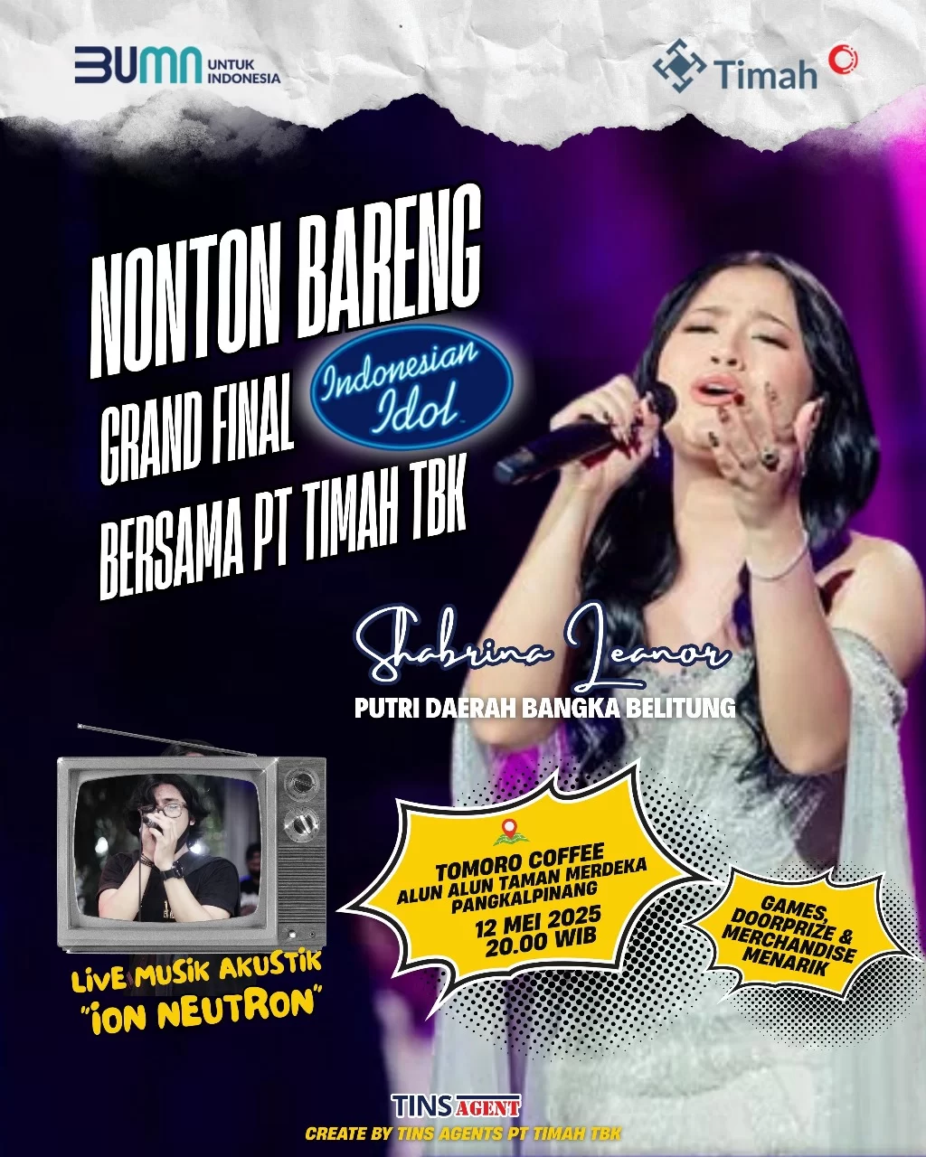 Gash – PT Timah Tbk ajak masyarakat Bangka Belitung beri dukungan kepada Finalis Indonesian Idol asal Belitung Timur Shabrina Leanor, Grand Final Indonesian Idol yang diselenggarakan di Tomoro Café, Alun-Alun Taman Merdeka, malam ini pukul 20.00 WIB.