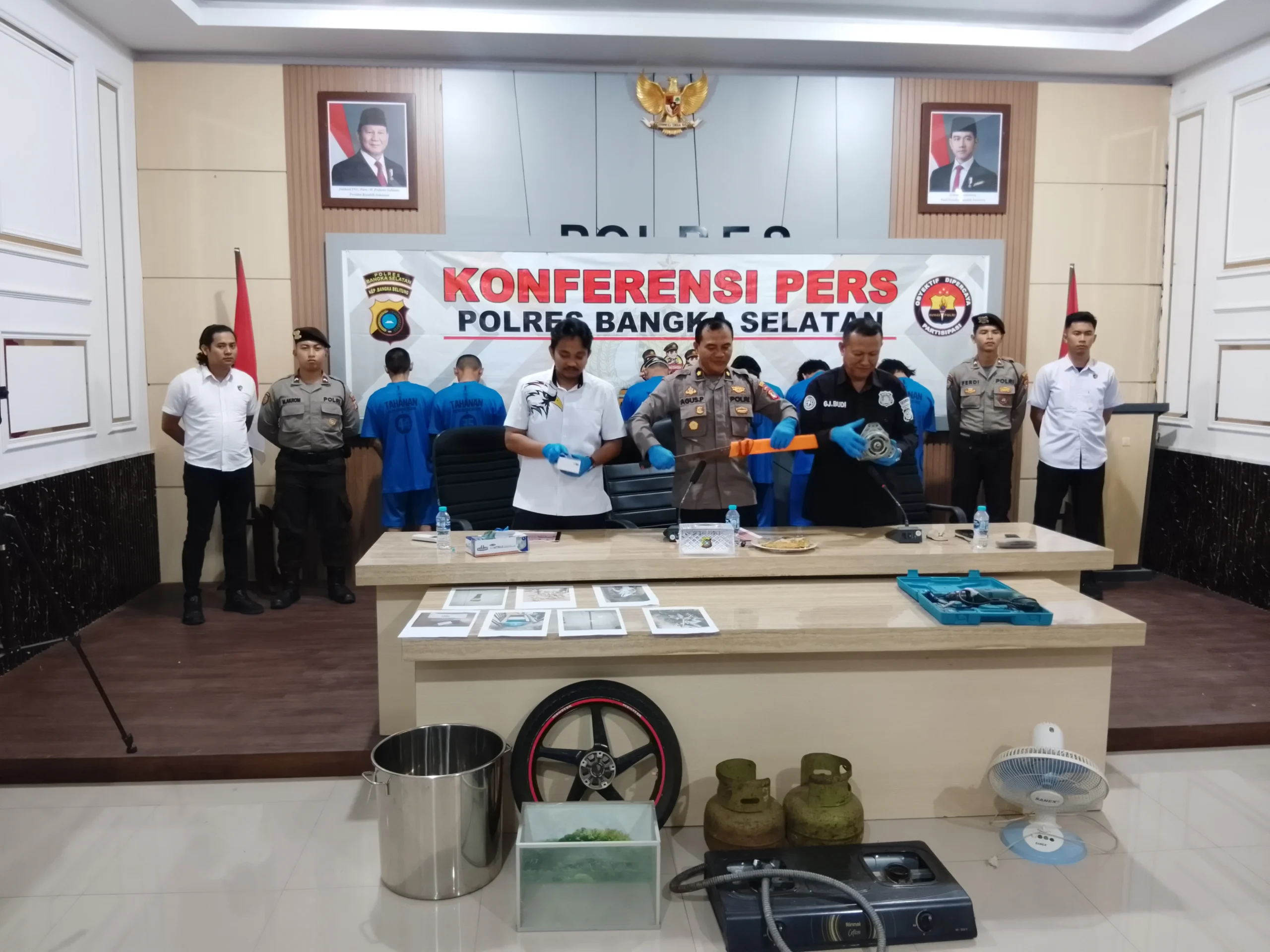 Konferensi pers resmi digelar di Mapolres Bangka Selatan, Selasa sore (21/10/2025), dipimpin oleh Kabag Ops Kompol Agus Prasetiawan, didampingi Kasat Reskrim AKP Raja Taufik Ikrar Buntani serta Kasi Humas Iptu GJ Budi.