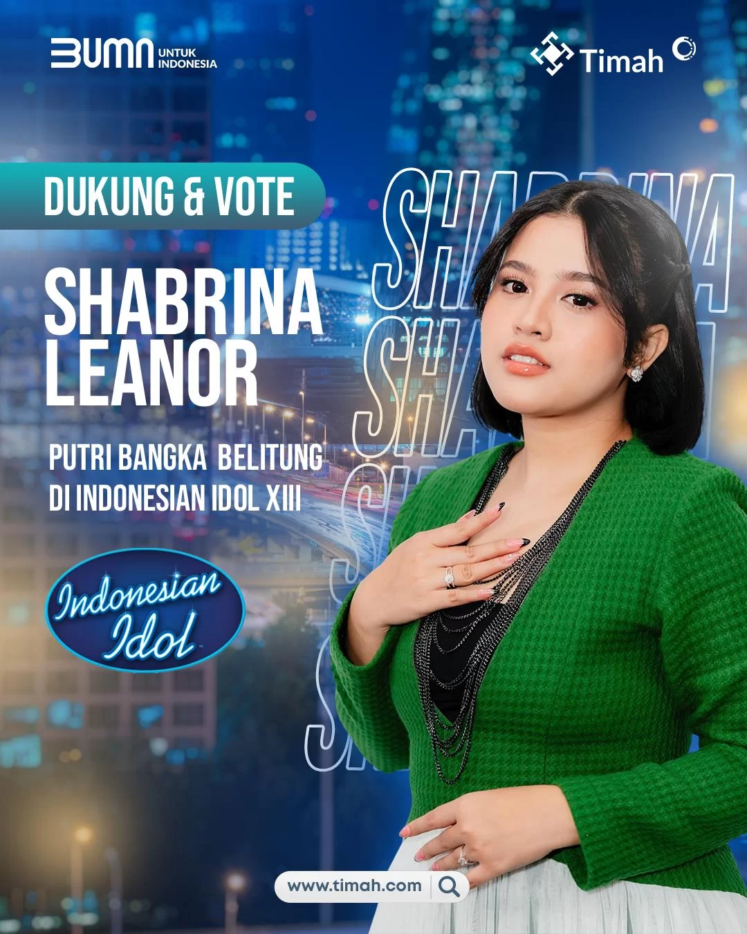 Penampilannya yang khas dan penuh karakter membuat masyarakat dari berbagai daerah memberikan dukungan luar biasa. Untuk mendukung penampilan Shabrina, PT Timah ikut memberikan dukungannya dalam menyukseskan penampilan Shabrina.
